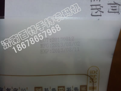 百特T-100B高清手持喷码机是国内首家采用英国技术生产的全内置充电式智能型喷码机,在国内手持喷码机行业中处于最领先技术! 国内首创速干墨、油性墨技术,填补了该行业在国内的空白,国内首创喷头朝下喷印技术,突破了手持喷码机只能水平喷印的局限,采用模块化外壳,克服了手持喷码机零配件式的组装方式所产生的诸多弊端,喷码机墨水安装方便快捷,克服了以前喷码机墨水安装时漏墨、不出墨的缺点。液晶显示屏可滚动显示打印内容,本喷码机采用 USB通讯接口,喷头分辨率为 200dpi ,电池为日本进口三阳锂电池,可在一系列的多孔和半孔物体表面进行喷印,如细木工板、木工板、板材、铁桶、钢桶、油漆桶、人造石、石材、木箱、塑钢、石膏板、木地板、钢管、薄膜、塑料膜等。本手持喷码机具有一机多用、清晰度高、性能稳定,喷印速度快、使用寿命长,字迹清楚、耗电量小,耗材经济 , 操作简便等多种优点,体积较小,充满电后在无电场合进行可连续喷印 10 小时以上 , 喷码机采用了外置墨盒,全封闭式墨路,快速换墨盒,绝不浪费一滴墨水。